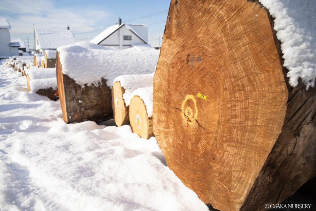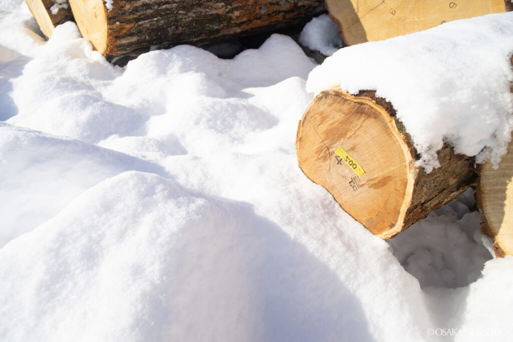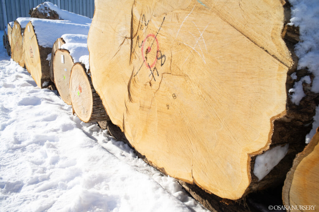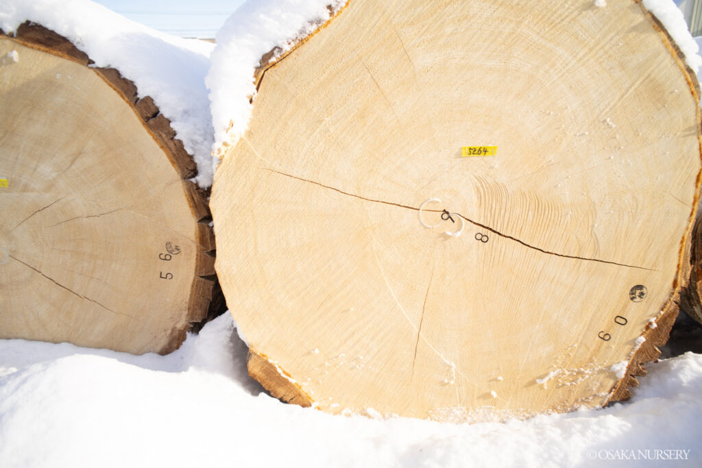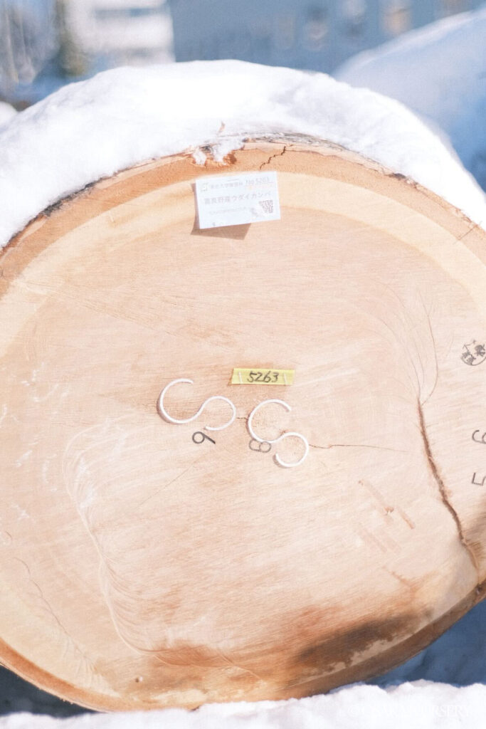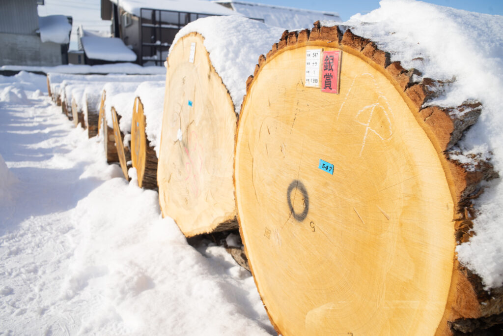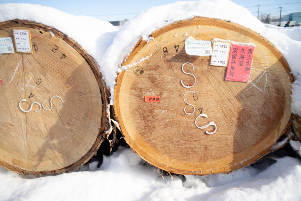 注目は、昨年秋に視察した東京大学北海道演習林(富良野)から出品された大径木のマカバです。立木の状態でも見ていたマカバは、旭川林産協同組合 理事長賞を受賞。この日の落札最高額となる140万円/㎥を記録し、私たちも嬉しく思いました。